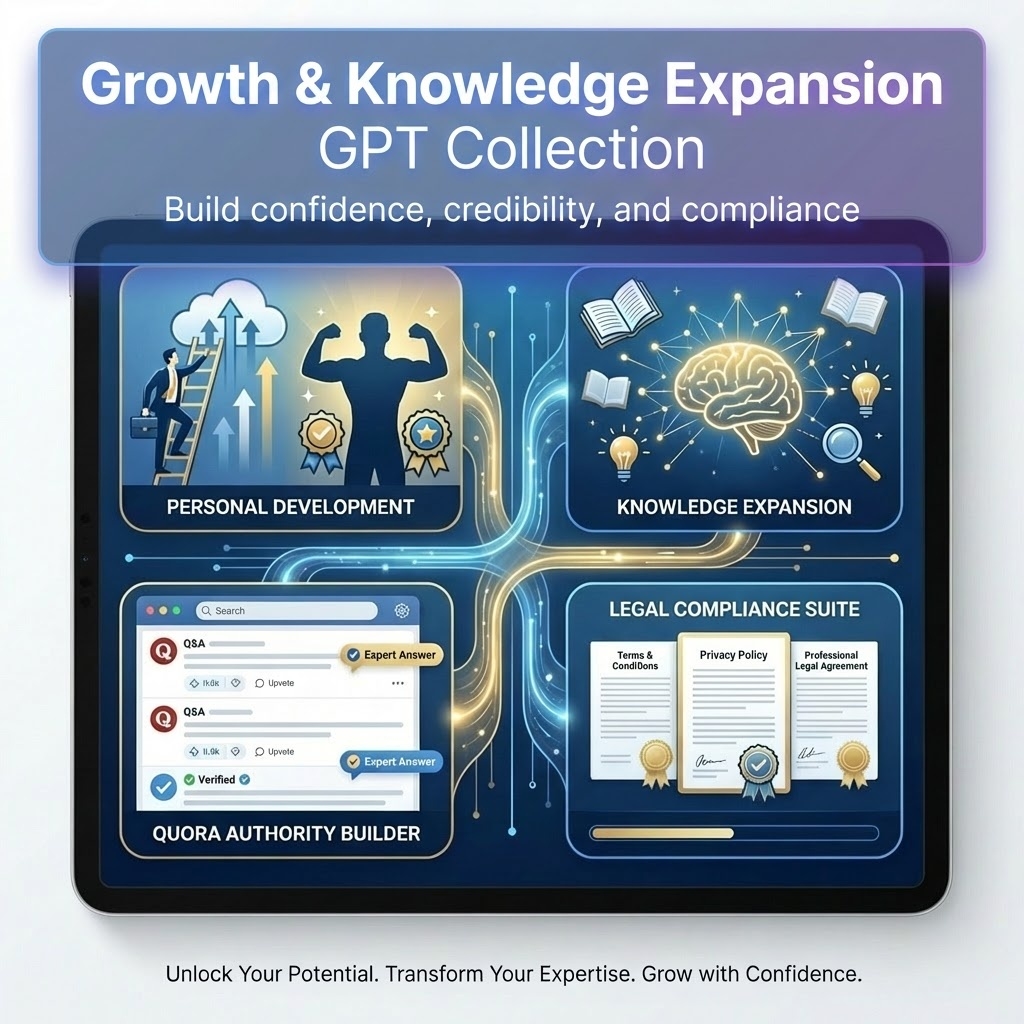 Growth bundle with GPTs for personal development, Quora authority, and legal pages. Build confidence, credibility, and compliance.